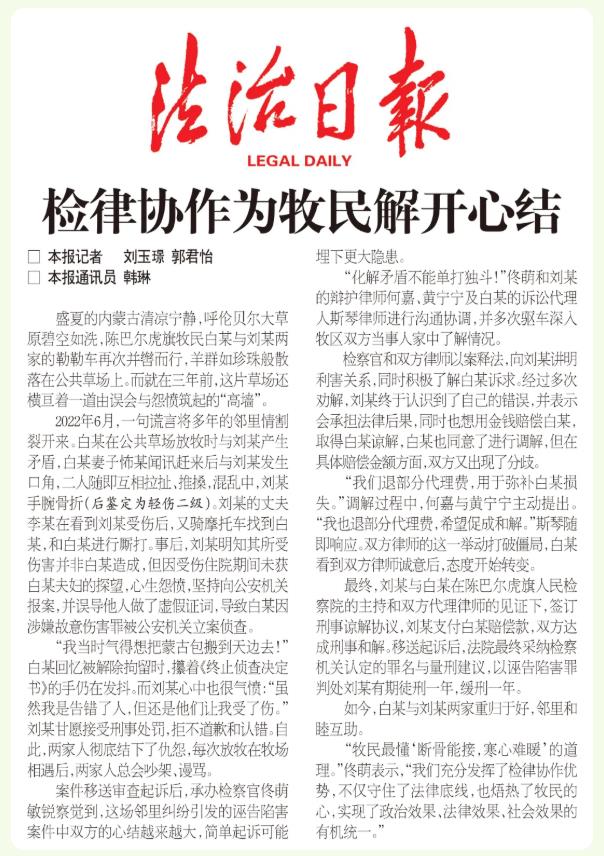 “牧民最懂‘?dāng)喙悄芙?,寒心難暖’的道理?!辟∶缺硎?,“我們充分發(fā)揮了檢律協(xié)作優(yōu)勢,不僅守住了法律底線,也焐熱了牧民的心,實現(xiàn)了政治效果、法律效果、社會效果的有機(jī)統(tǒng)一。”(作者 劉玉璟 郭君怡 韓琳)