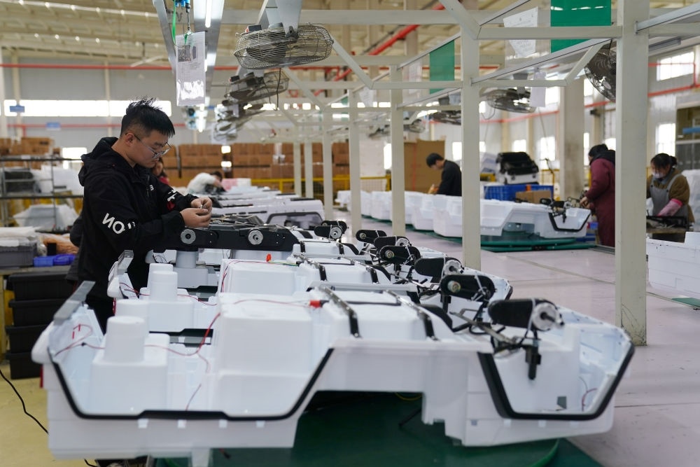 3月16日,工人在河北省邢臺經(jīng)濟開發(fā)區(qū)一家外貿(mào)企業(yè)生產(chǎn)車間組裝童車產(chǎn)品。新華社記者 駱學峰 攝