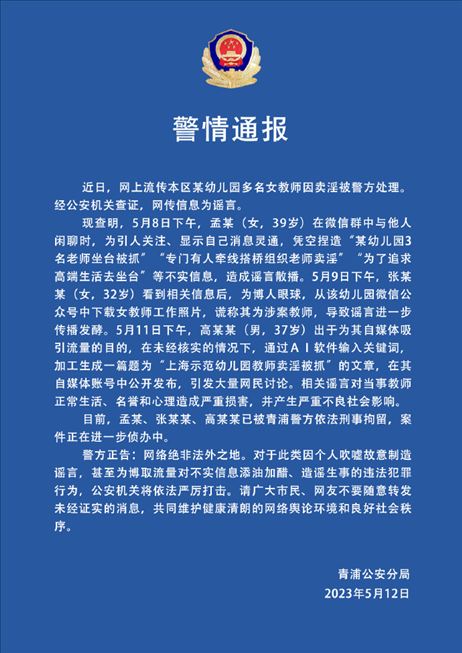 ·上海青浦警方:網(wǎng)傳幼兒園多名女教師賣淫被處理系謠言,刑拘3人。