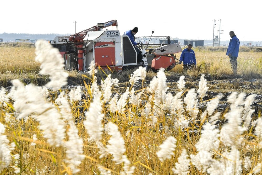 在吉林省大安市海坨鄉(xiāng)鹽堿地生態(tài)修復(fù)治理示范基地,農(nóng)民駕駛收割機收割水稻(2022年10月12日攝)。新華社記者 許暢 攝