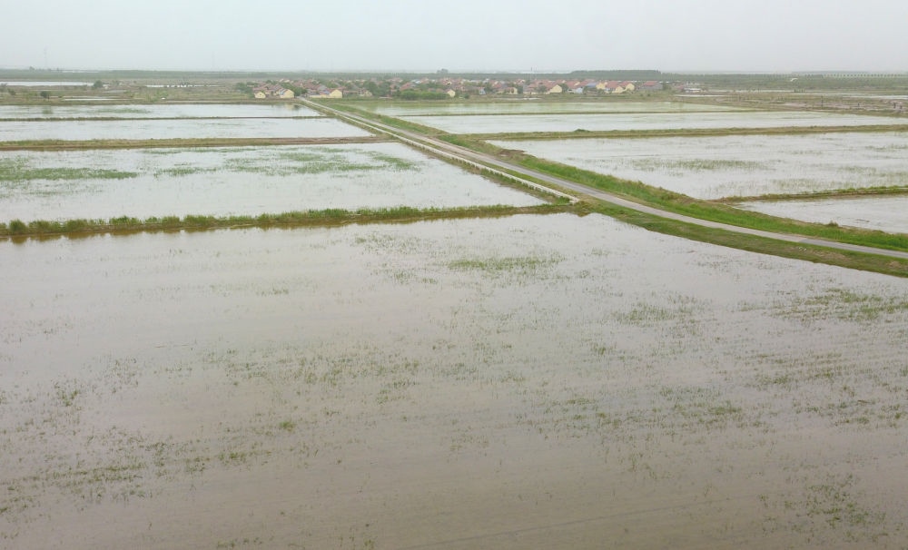 5月20日,山東省東營市墾利區(qū)黃河口鎮(zhèn),鹽堿地改良的田地上已播種海水稻秧苗(無人機照片)。新華社記者 徐速繪 攝