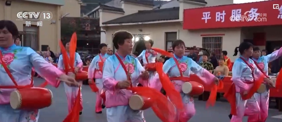 為了參加這次“村晚”,村里喜歡樂器的7個村民臨時組建了鑼鼓隊,每天積極練習(xí)。鼓聲一響,瞬間點燃了現(xiàn)場氣氛,上百人圍桌就餐看演出,年的味道就這樣來了。