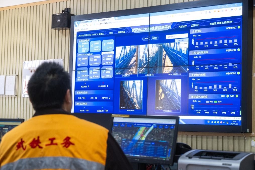 1月23日,武漢長(zhǎng)江大橋橋梁車間員工在主控室對(duì)武漢長(zhǎng)江大橋進(jìn)行監(jiān)測(cè)。新華社記者肖藝九 攝