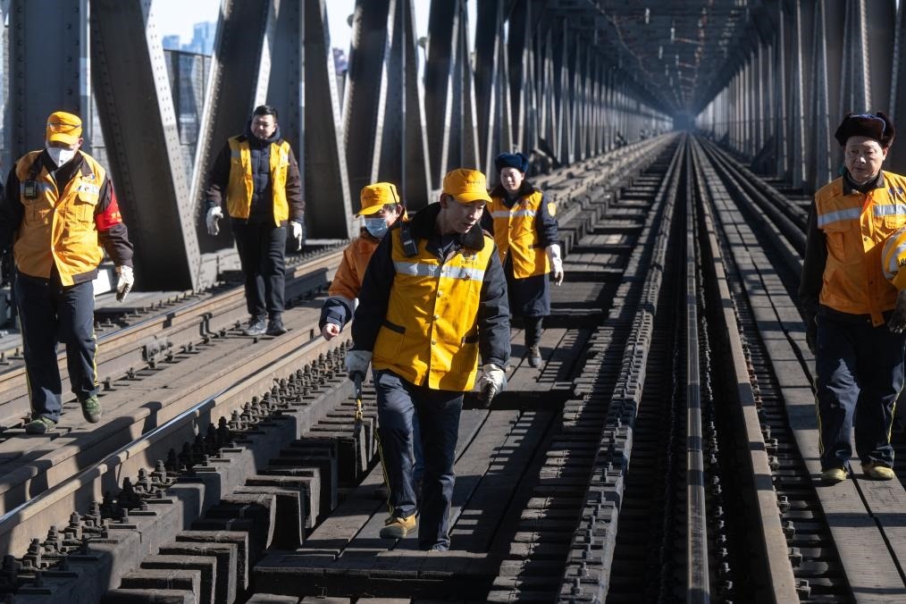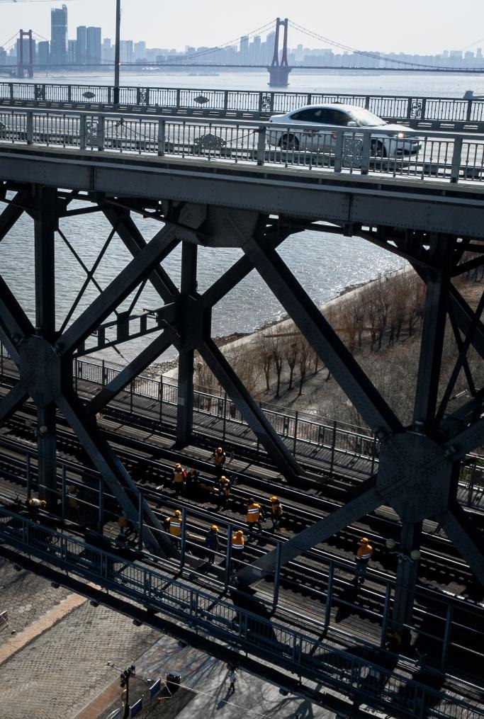 農(nóng)歷大年初三,湖北武漢陽(yáng)光明媚。“萬(wàn)里長(zhǎng)江第一橋”——武漢長(zhǎng)江大橋宛若一條巨龍飛架于江水之上,氣勢(shì)恢宏。身穿工作服的陳卿明和同事,低頭、彎腰,循著大橋鐵道仔細(xì)地檢視鋼梁、枕木。