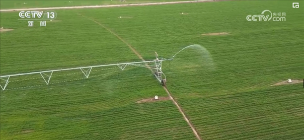 根據(jù)農(nóng)業(yè)專家的精準(zhǔn)測(cè)算和調(diào)度,園區(qū)工作人員啟動(dòng)了大型指針式噴灌機(jī)。