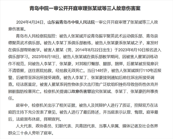 ·青島8歲男童武術俱樂部被毆打致死案4月24日開庭,將擇期判。