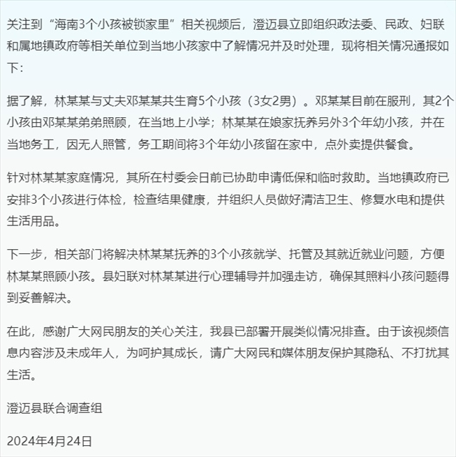 ·官方通報“海南3個小孩被鎖家里”:村委會已協助申請低保和臨時救助。