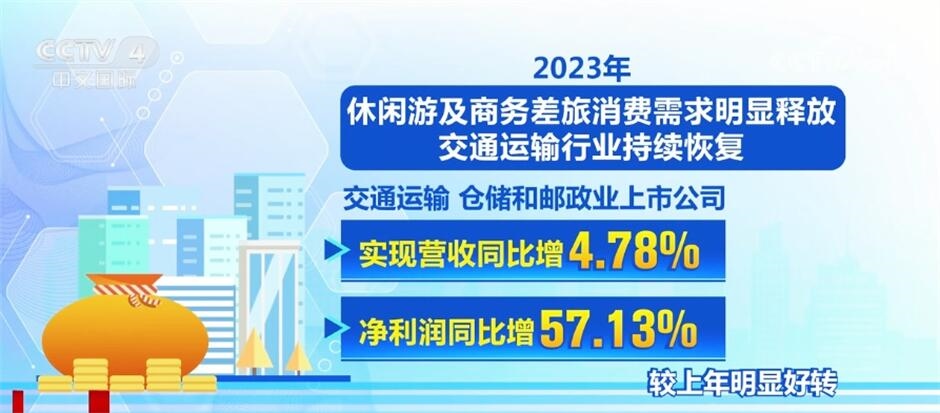 2023年,休閑游及商務(wù)差旅消費(fèi)需求明顯釋放,交通運(yùn)輸行業(yè)持續(xù)恢復(fù),交通運(yùn)輸、倉儲和郵政業(yè)上市公司實(shí)現(xiàn)營收、凈利潤同比增4.78%、57.13%,較上年明顯好轉(zhuǎn)。