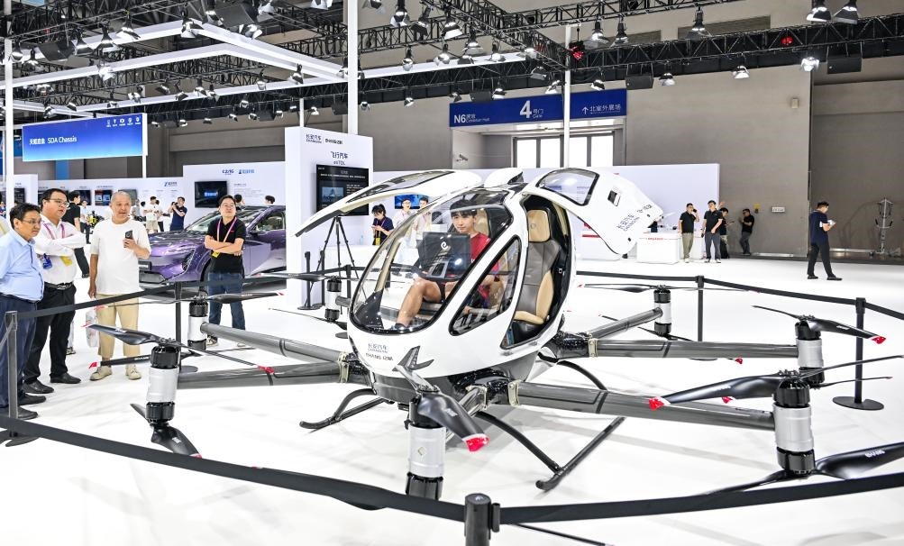 2025年9月5日,在重慶舉行的2025世界智能產(chǎn)業(yè)博覽會(huì)上,觀眾在長安汽車展區(qū)參觀、體驗(yàn)“飛行汽車”。新華社記者王全超攝