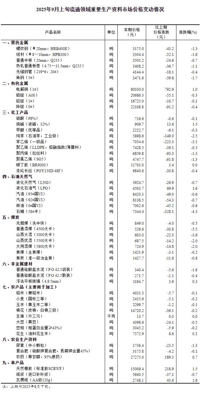 據(jù)國家統(tǒng)計局網(wǎng)站消息,國家統(tǒng)計局14日公布2025年9月上旬流通領域重要生產(chǎn)資料市場價格變動情況。