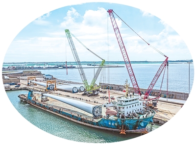 在山東省榮成市石島管理區(qū)的海上風電產業(yè)基地,超大型風電葉片正在吊裝和運輸,準備運往海上作業(yè)區(qū)進行安裝。李信君攝(人民視覺)
