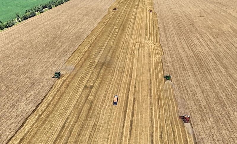 8月5日,位于黑龍江省五大連池市的大慶油田農(nóng)場(chǎng)調(diào)動(dòng)多臺(tái)聯(lián)合收割機(jī)搶收小麥(無人機(jī)照片)。