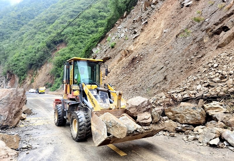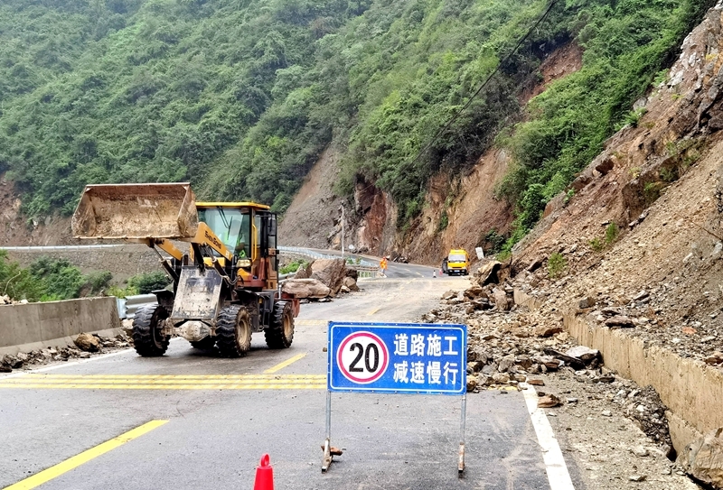8月10日,在468省道??悼h寺坪鎮(zhèn)升石坪路段,公路養(yǎng)護(hù)部門工作人員駕駛裝載機處置路旁垮方。