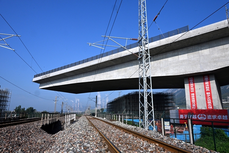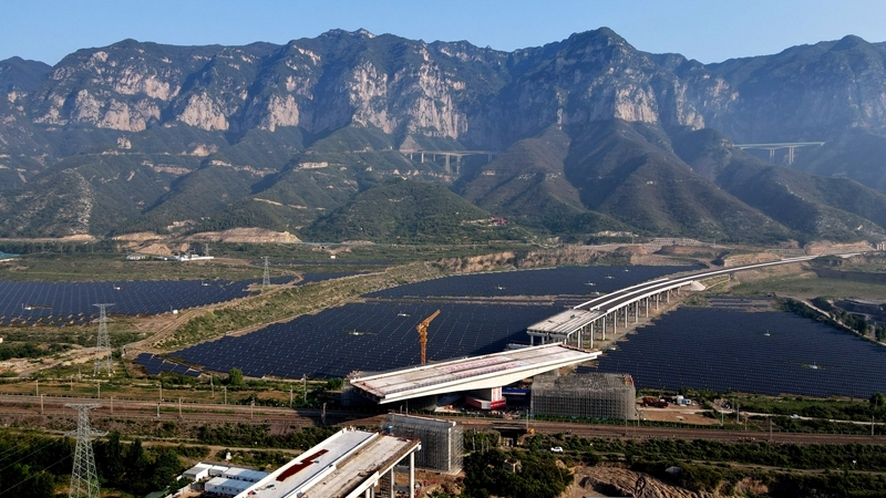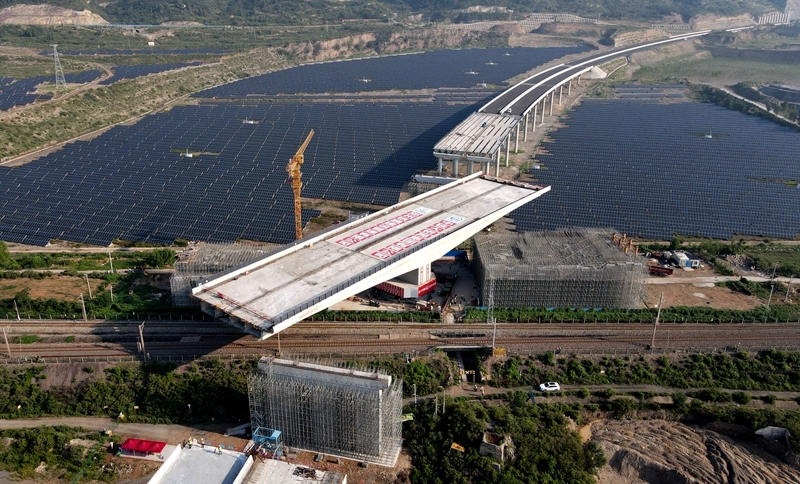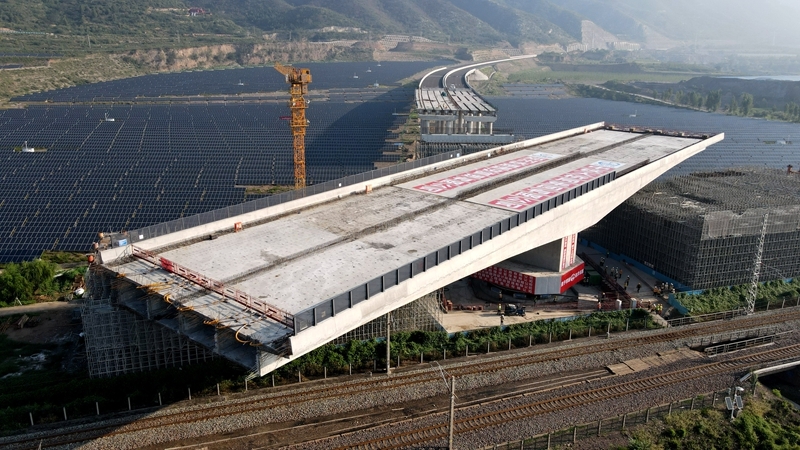 這是8月11日拍攝的河南省濟源市沿太行山高速公路跨焦柳鐵路立交橋轉體施工現場(無人機照片)。