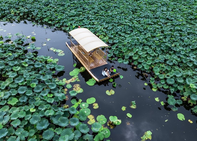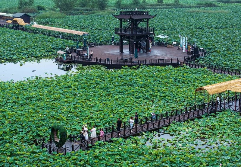 8月13日,游客在江蘇省興化市萬畝荷塘景區(qū)賞荷游玩(無人機(jī)照片)。