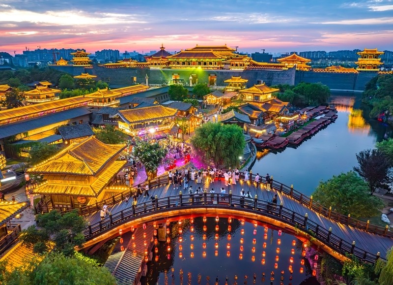 8月11日,湖北省襄陽市唐城景區(qū)夜景璀璨,吸引游客前來游玩(無人機(jī)照片)。