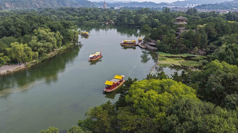 8月12日,游客在河北省承德市避暑山莊景區(qū)游玩觀景(無人機(jī)照片)。