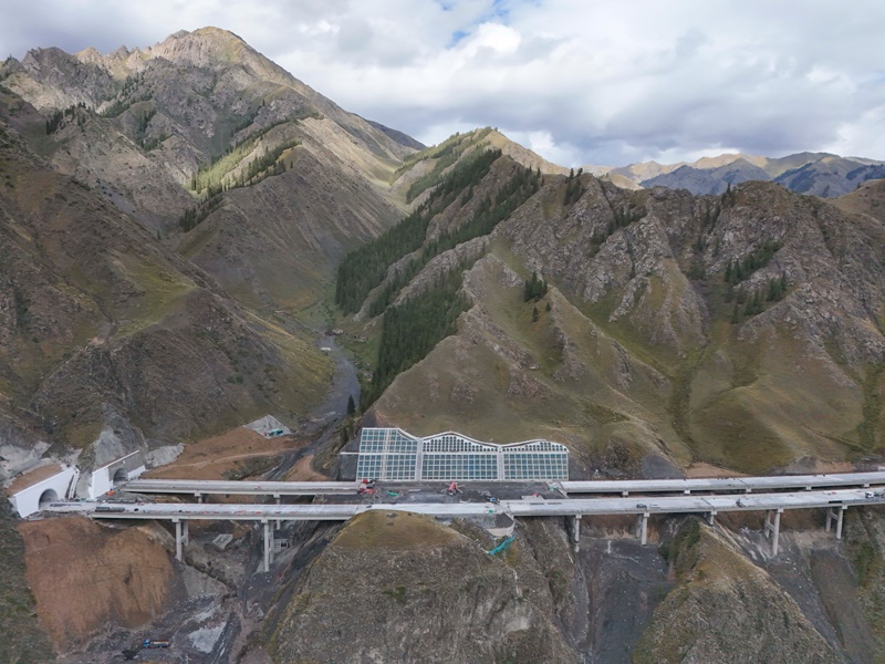 工人在新疆烏尉高速公路躍進3號隧道南端施工(8月19日攝,無人機照片)。
