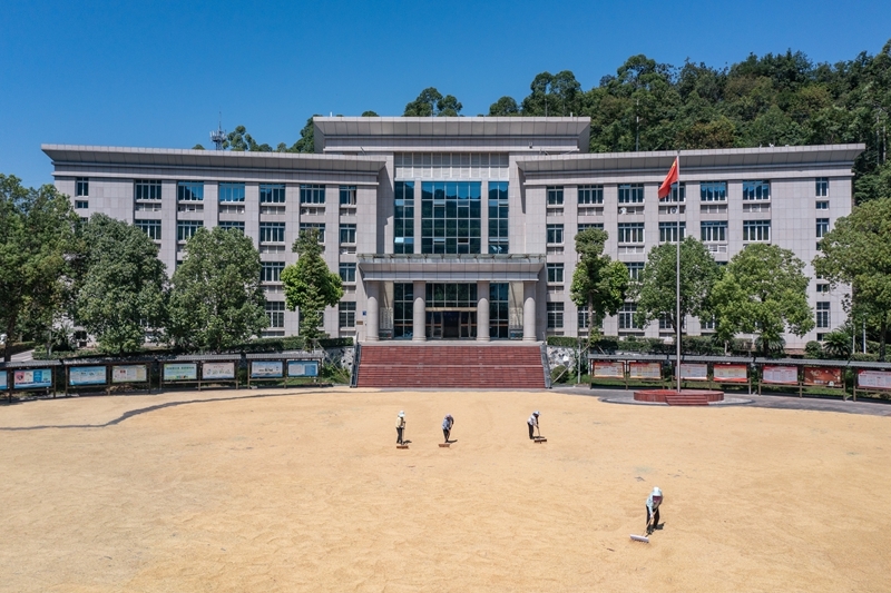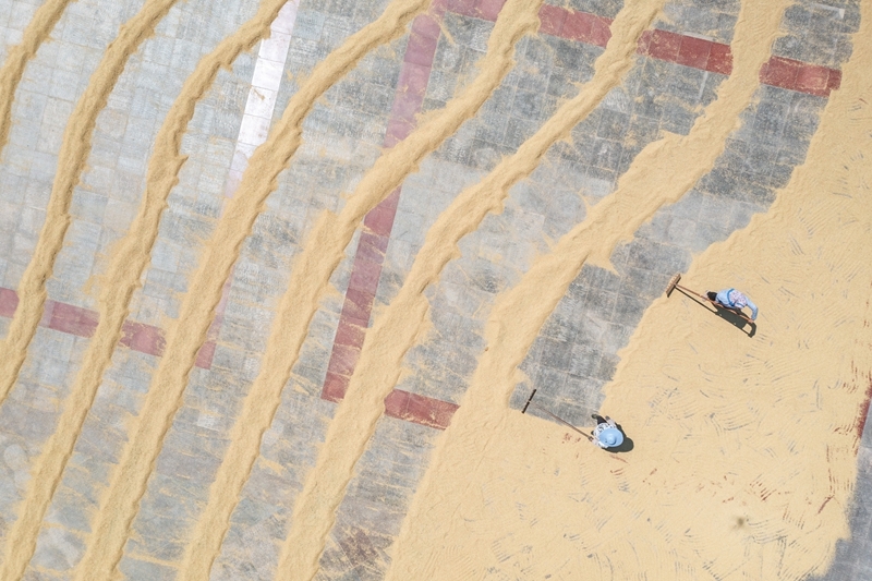 8月20日,人們?cè)谥貞c市永川區(qū)紅爐鎮(zhèn)政府廣場(chǎng)上晾曬糧食(無人機(jī)照片)。