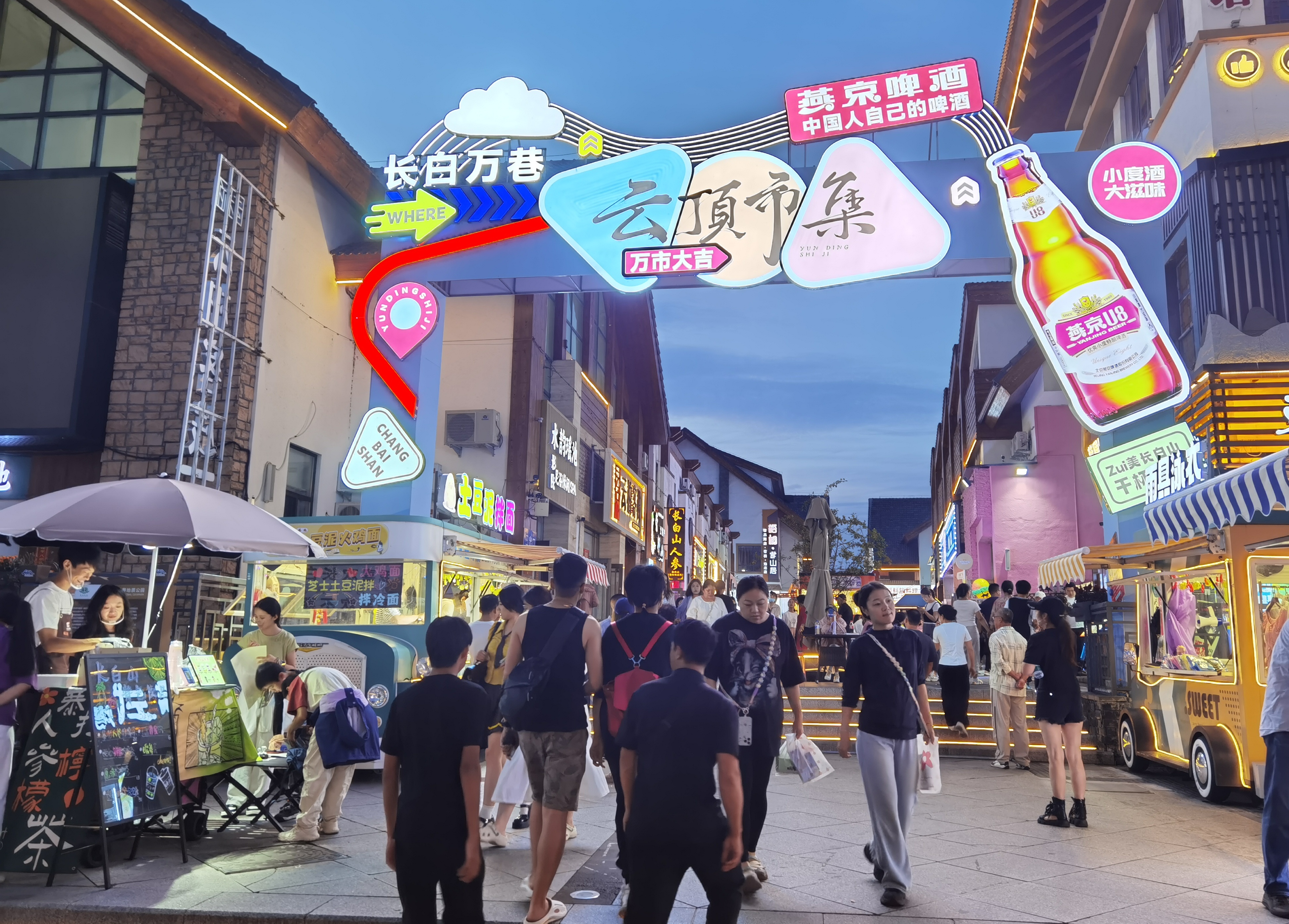 夜幕初降,云頂市集人潮涌動(dòng),樂(lè)隊(duì)彈唱與林間松風(fēng)交織;雪絨花音樂(lè)生活館里,燈光璀璨,民謠悠遠(yuǎn);美人松愛(ài)情森林里,漫步其間的情侶與家庭,寫(xiě)下屬于他們的浪漫記憶。更令人驚艷的,是今夏盛大開(kāi)街的恩都里(滿語(yǔ)enduri意為“神靈”)休閑度假商旅社區(qū)。