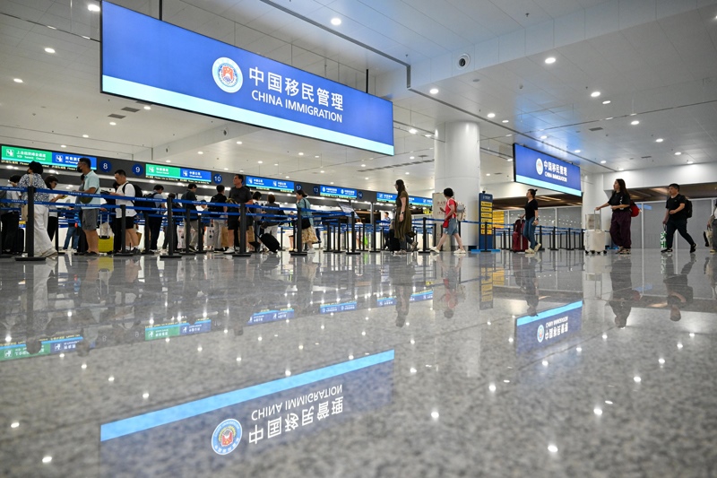 8月27日,在天津?yàn)I海國際機(jī)場T1航站樓,旅客排隊(duì)入境查驗(yàn)。