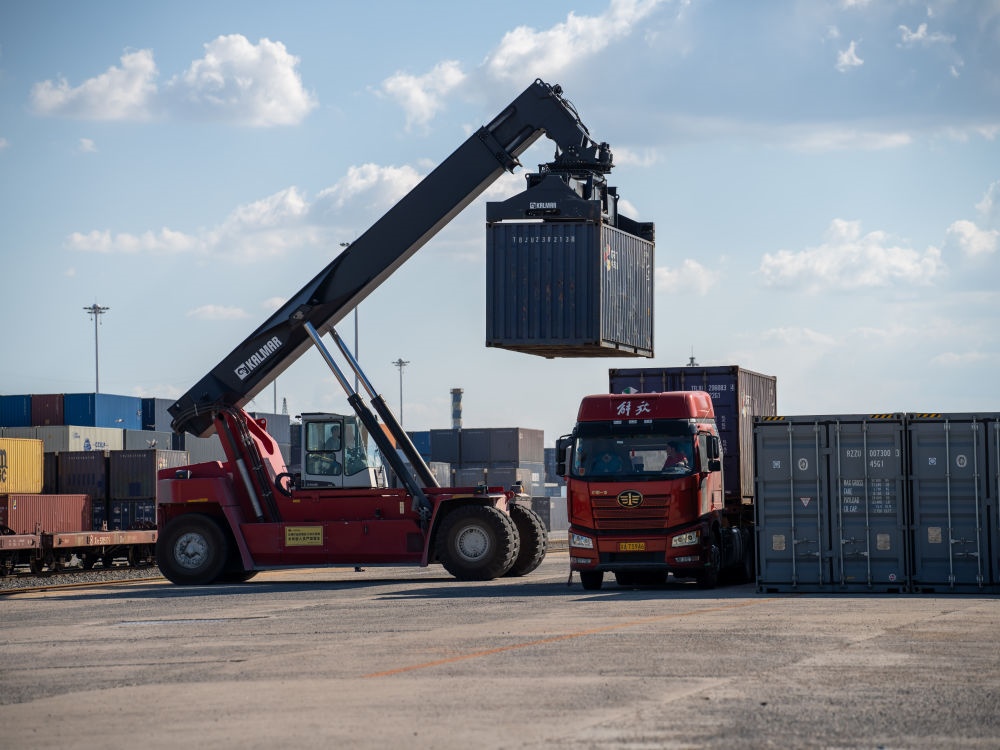 2025年7月14日,長春興隆鐵路口岸作業(yè)區(qū)內的吊裝車將集裝箱裝載到卡車上。新華社記者 邵澤東 攝