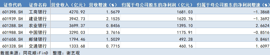 具體來看,農(nóng)業(yè)銀行、交通銀行、郵儲(chǔ)銀行實(shí)現(xiàn)營收和凈利潤指標(biāo)雙增,但工商銀行、建設(shè)銀行、中國銀行歸屬于母公司股東的凈利潤同比有所下降,降幅分別為1.39%、1.37%和0.85%。