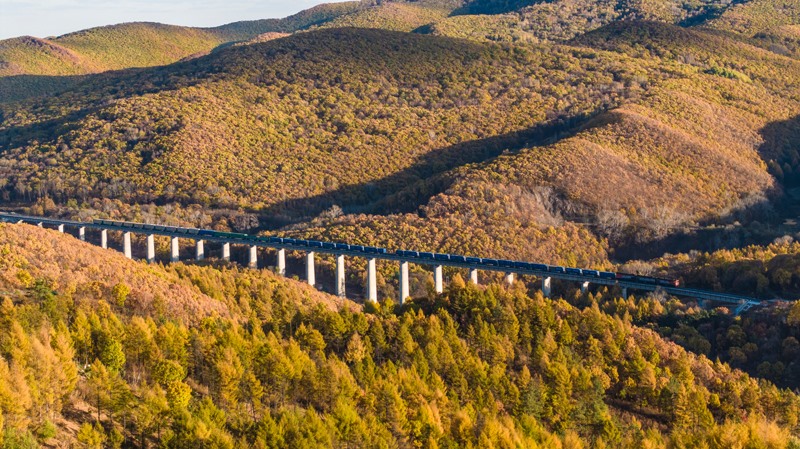 10月18日,一列滿載進(jìn)口物資的貨物列車駛向中國(guó)鐵路哈爾濱局集團(tuán)有限公司綏芬河站(無(wú)人機(jī)照片)。