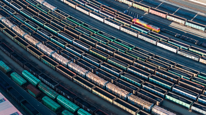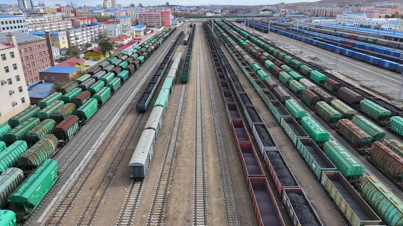 10月18日,在中國(guó)鐵路哈爾濱局集團(tuán)有限公司綏芬河站南場(chǎng),滿載進(jìn)口貨物的列車等待解體換裝(無(wú)人機(jī)照片)。