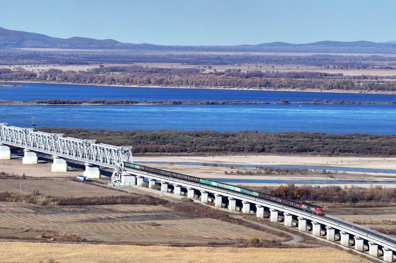 10月16日,滿載進(jìn)口物資的貨物列車通過(guò)同江鐵路大橋駛向中國(guó)鐵路哈爾濱局集團(tuán)有限公司同江北站(無(wú)人機(jī)照片)。