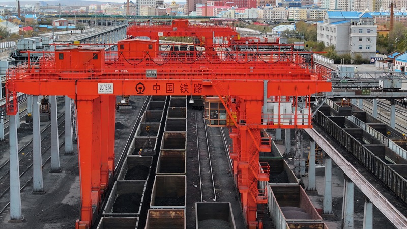 10月18日,在中國(guó)鐵路哈爾濱局集團(tuán)有限公司滿洲里站,機(jī)械化換裝場(chǎng)在對(duì)進(jìn)口貨物進(jìn)行換裝作業(yè)(無(wú)人機(jī)照片)。