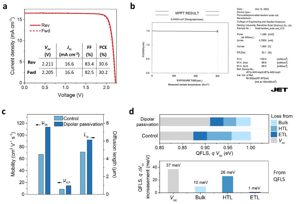 太赫茲輻射探測(cè)診斷結(jié)果清晰揭示了偶極鈍化策略在促進(jìn)電荷傳輸、抑制損耗等方面的微觀機(jī)制。實(shí)驗(yàn)數(shù)據(jù)顯示,經(jīng)鈍化處理的鈣鈦礦薄膜,總載流子遷移率提升68%以上,載流子擴(kuò)散長(zhǎng)度延長(zhǎng)近30%。