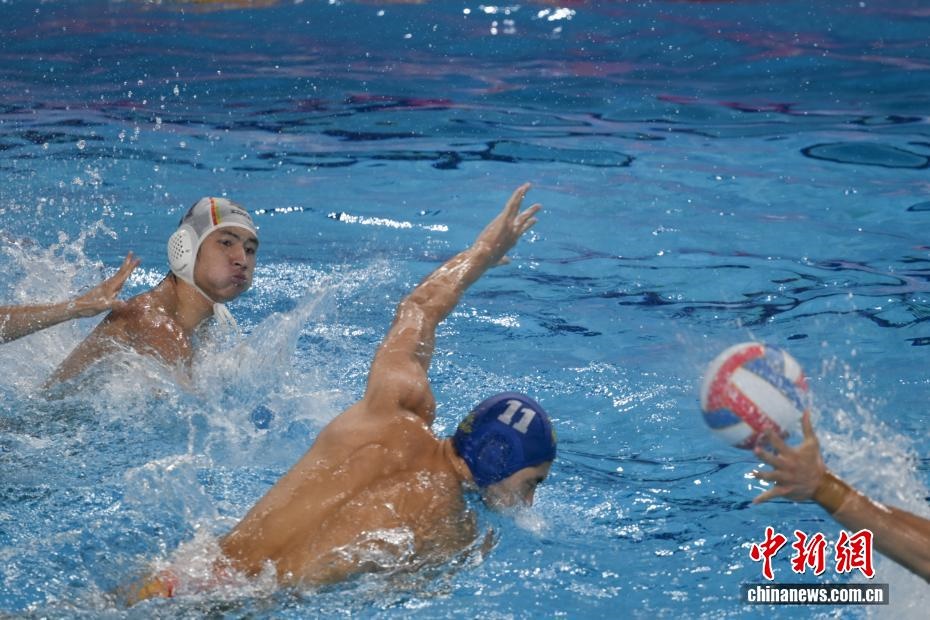 10月27日晚,在廣東廣州舉行的第十五屆全國運(yùn)動(dòng)會(huì)水球男子組比賽金牌賽中,廣東隊(duì)以16比9戰(zhàn)勝上海隊(duì),獲得金牌。圖為上海隊(duì)11號(hào)運(yùn)動(dòng)員蔡宇浩(白帽)在比賽中進(jìn)攻。
