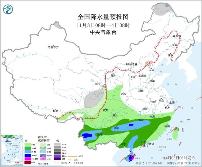 11月3日8時(shí)至4日8時(shí),西藏東部、川西高原中北部等地部分地區(qū)有小到中雪或雨夾雪。江南中南部、西南地區(qū)南部、華南大部等地部分地區(qū)有中到大雨,其中,湖南西部、云南西部、海南島中東部等地部分地區(qū)有暴雨,海南島東北部局地有大暴雨(100~240毫米);內(nèi)蒙古中東部、東北地區(qū)有4~5級(jí)風(fēng),陣風(fēng)6~7級(jí);臺(tái)灣海峽、巴士海峽將有6~8級(jí)、陣風(fēng)9級(jí)的風(fēng),東海南部海域、臺(tái)灣以東洋面、北部灣、瓊州海峽、南海北部和中東部海域?qū)⒂?~7級(jí)、陣風(fēng)8級(jí)的風(fēng)。