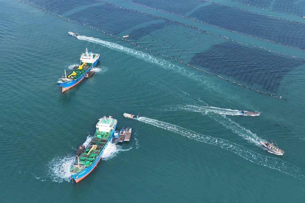 ↑ 11月10日,在山東省榮成市桑溝灣海洋牧場(chǎng),養(yǎng)殖工人在養(yǎng)殖區(qū)穿梭作業(yè)(無(wú)人機(jī)照片)。新華社發(fā)(王福東 攝)