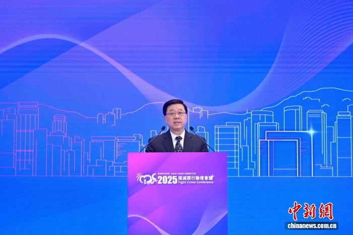 圖為香港特區(qū)行政長官李家超在“2025撲滅罪行聯(lián)席會(huì)議”上致辭。 (香港特區(qū)政府新聞處供圖)