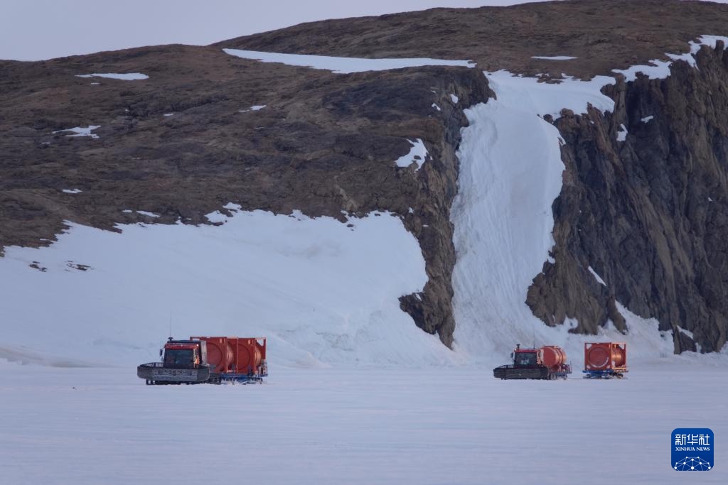 北京時(shí)間12月3日凌晨,雪地車?yán)訚M燃油的油罐離開“雪龍2”號(hào),駛向中山站。新華社記者 顧天成 攝