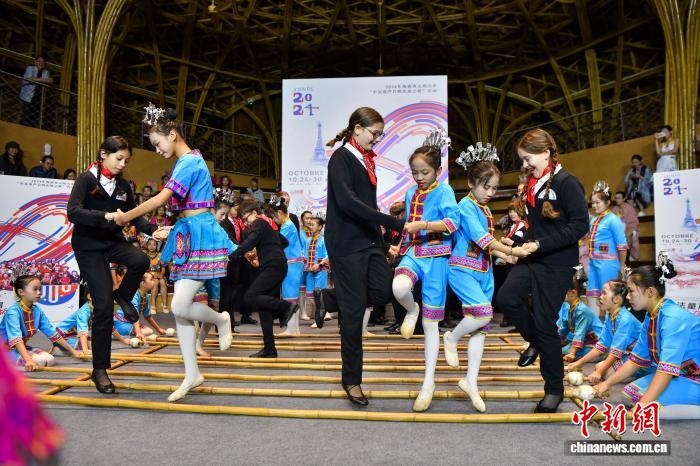2024年10月27日,海南省五指山市,法國巴黎寶麗聲童聲合唱團(tuán)與海南五指山黎苗童聲合唱團(tuán)成員一起體驗竹竿舞。中新社記者 駱云飛 攝