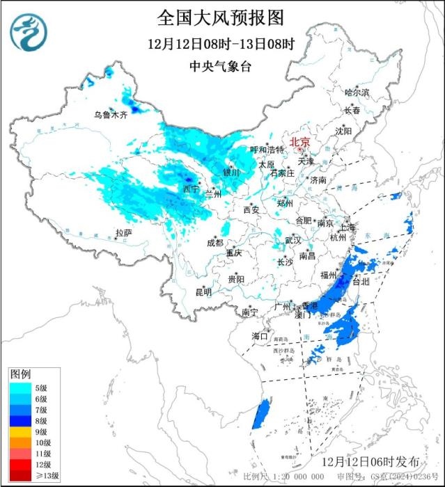 此外,12月12日08時至13日08時,新疆北部、青海、西藏北部、內蒙古西部、四川北部、甘肅東部、寧夏、陜西西北部等地部分地區(qū)有5~7級、陣風8~9級的大風,其中,新疆山口地區(qū)陣風可達10~11級;東海南部部分海域、臺灣海峽、巴士海峽、南海東北部和中東部部分海域將有7級、陣風8~9級的大風。中央氣象臺12月12日06時繼續(xù)發(fā)布大風藍色預警。