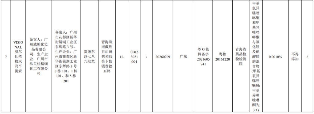 人民網(wǎng)北京10月26日電 (記者孫紅麗)國(guó)家藥監(jiān)局網(wǎng)站26日發(fā)布通告,公布7批次化妝品檢出禁用原料,標(biāo)示名稱(chēng)分別是幻臻水性彩色指甲油HZ088、幻臻水性彩色指甲油HZ056、unna美甲功能膠加固膠、unna美甲功能膠底膠、貝比拉比蛋黃油、嬰貝萱嬰膚霜、VISIONAL威爾仕植物水潤(rùn)平衡素。