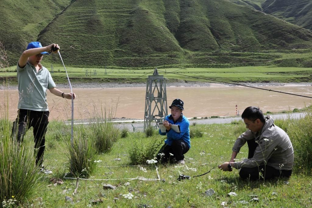 7月22日,長(zhǎng)江科學(xué)院水土保持研究所的科考隊(duì)員在通天河直門達(dá)河段進(jìn)行植被樣方調(diào)查。新華社記者劉詩平攝