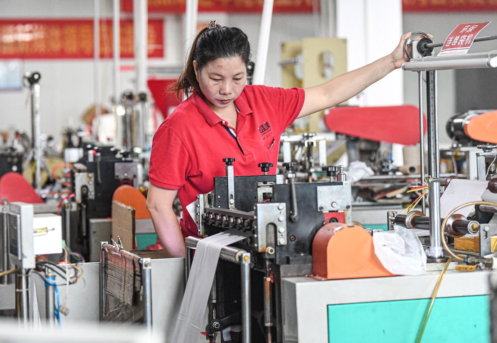 工作人員在海口誠佳美塑料包裝有限公司車間生產(chǎn)全生物降解袋(2020年11月4日攝)。新華社記者 蒲曉旭 攝