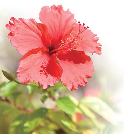 朱槿花大色艷,花蕊細(xì)長伸出于花瓣之外,花柱五裂,柱頭如粉球,花形俏麗喜慶,在我國兩廣地區(qū)被稱為“大紅花”,深受人們喜愛。在南寧,常見的朱槿花有十幾個(gè)品種,既有獨(dú)株高兩三米的小喬木、適合密植為樹籬的灌木,也有適合庭院、窗臺精巧布置的盆栽。