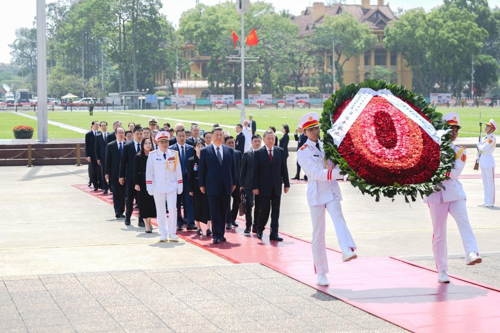 15日上午,在蘇林陪同下,習近平瞻仰胡志明陵并敬獻花圈。
