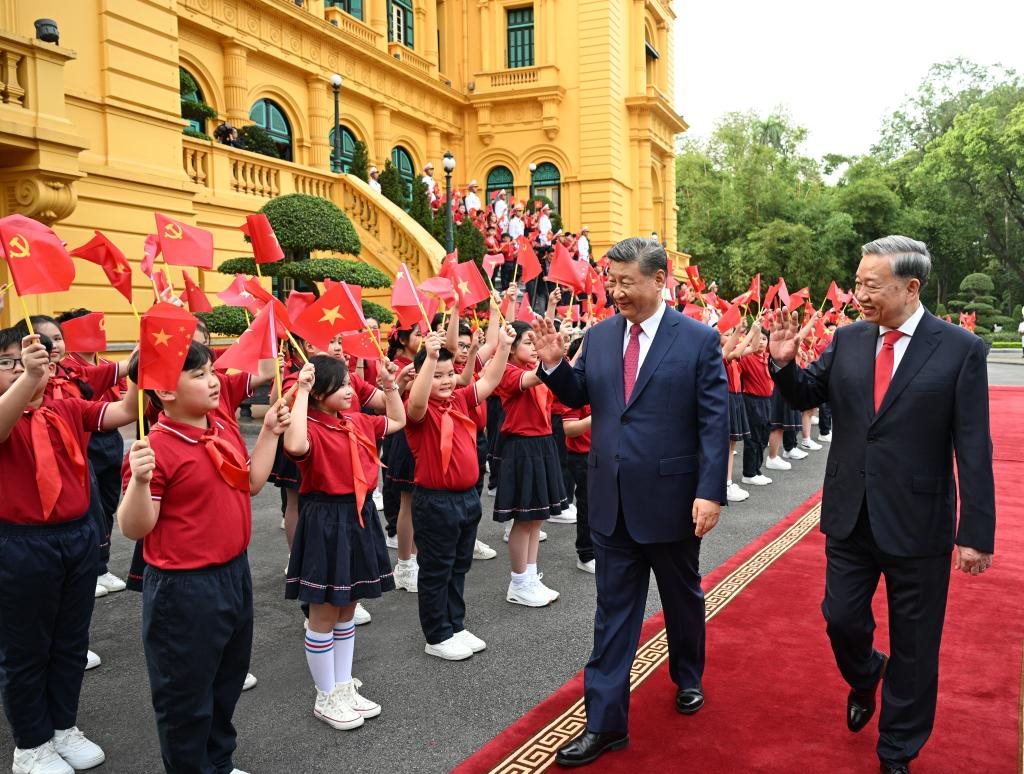 主席府廣場上,五星紅旗同金星紅旗迎風飄揚,200多名越南少年兒童揮舞旗幟,熱烈歡迎習近平到訪。