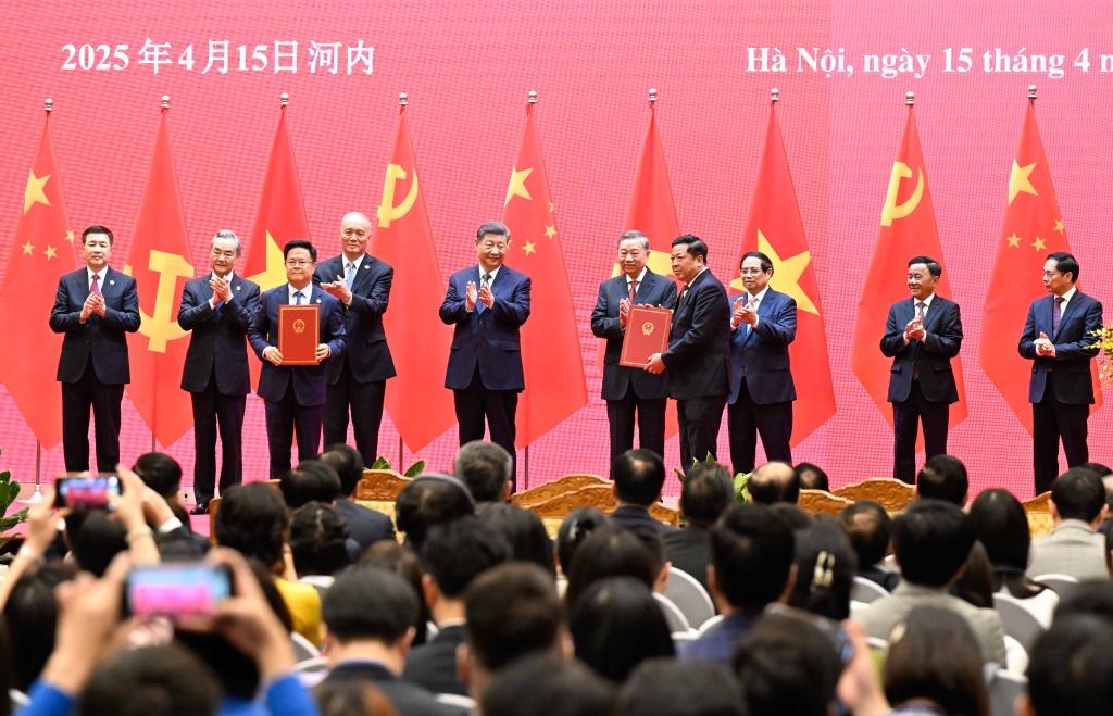 會談后,兩黨總書記共同見證中越雙方簽署的45份雙邊合作文本展示,涵蓋互聯(lián)互通、人工智能、海關檢驗檢疫、農(nóng)產(chǎn)品貿(mào)易、文化和體育、民生、人力資源開發(fā)、媒體等領域。