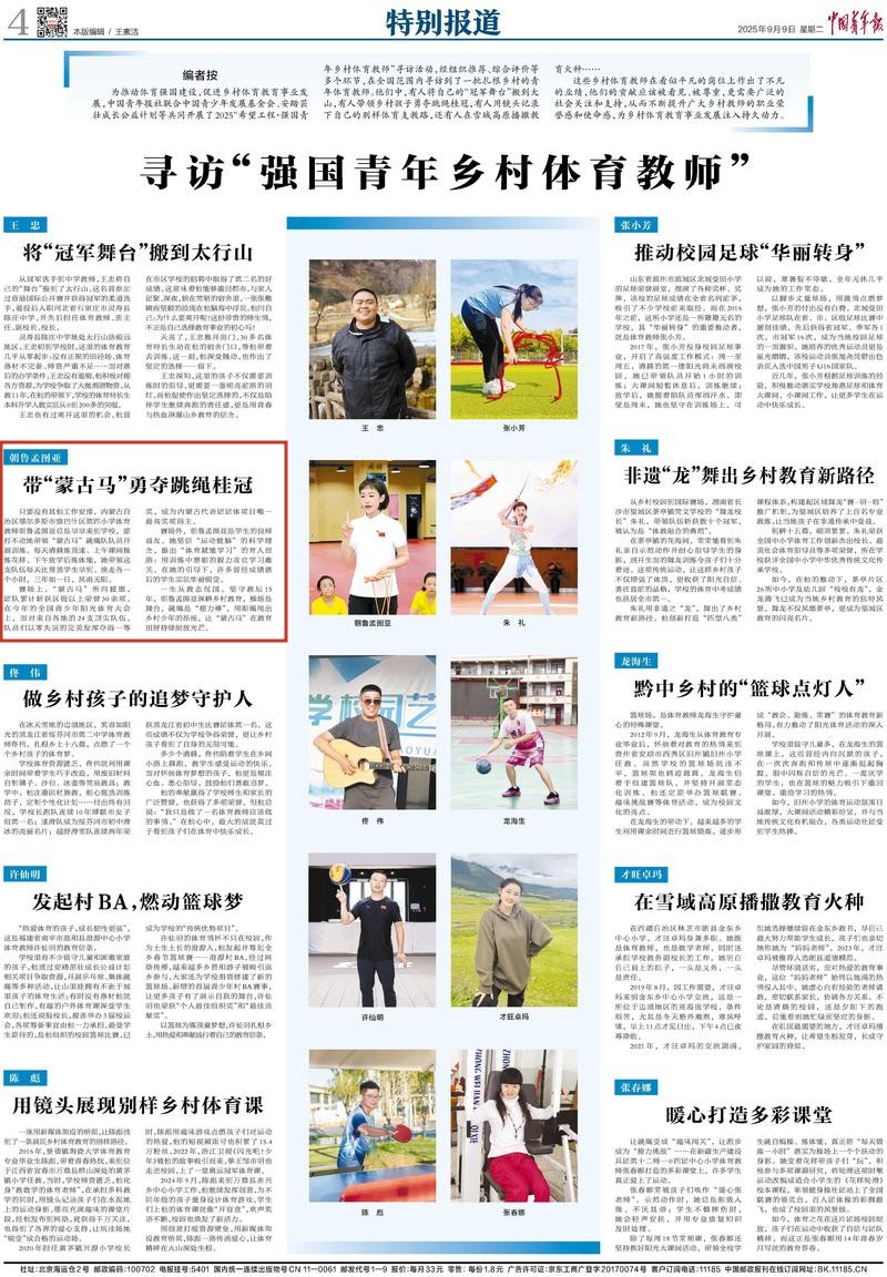 2025年9月9日,《中國(guó)青年報(bào)》第4版刊發(fā)題為《朝魯孟圖亞帶“蒙古馬”勇奪跳繩桂冠》的文章,報(bào)道了內(nèi)蒙古自治區(qū)鄂爾多斯市康巴什區(qū)第四小學(xué)體育教師朝魯孟圖亞深耕鄉(xiāng)村教育,用細(xì)繩甩出鄉(xiāng)村少年的昂揚(yáng),讓“蒙古馬”在教育田野持續(xù)綻放光芒。