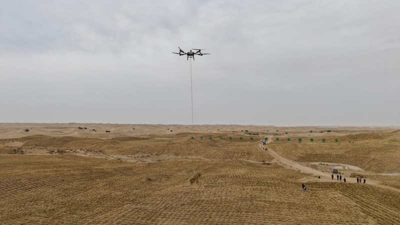 當(dāng)日上午10時(shí),在黃河“幾字彎”西岸的項(xiàng)目現(xiàn)場(chǎng),工程車輛整齊列隊(duì)蓄勢(shì)待發(fā),治沙工作者與建設(shè)人員精神抖擻,處處涌動(dòng)著起步即沖刺、實(shí)干勇?tīng)?zhēng)先的奮斗熱潮。隨著響亮的“開(kāi)工”令下,現(xiàn)場(chǎng)機(jī)械轟鳴,打樁機(jī)精準(zhǔn)作業(yè),無(wú)人機(jī)吊運(yùn)草料,手扶式沙障機(jī)忙著扎設(shè)草方格……阿拉善盟“十五五”時(shí)期生態(tài)建設(shè)的首場(chǎng)戰(zhàn)役——2026年“三北”六期工程攻堅(jiān)戰(zhàn)全面打響。