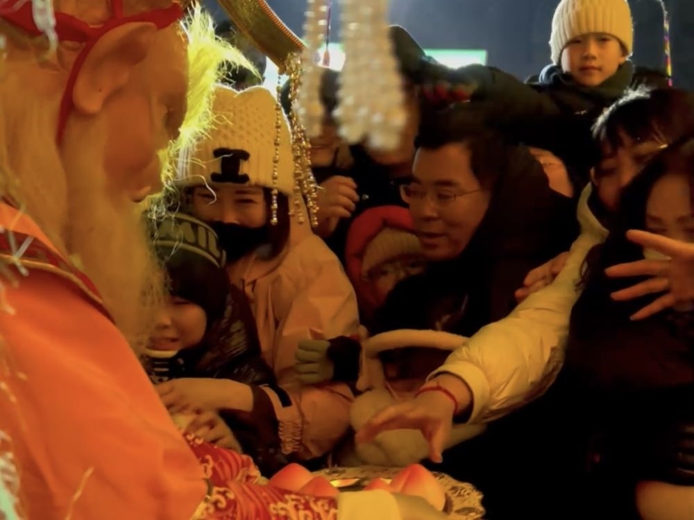 在長春動植物公園,游客領(lǐng)取龍年蟠桃。新華社記者趙丹丹 攝